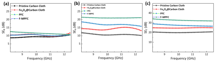 基于以上现状,公司屈孟男教授和何金梅副教授研究团队结合公司化学工程学科优势与碳材料特色,提出和获得了具有超双疏性能的电磁屏蔽碳布。该方法首先通过水热法将Fe3O4纳米颗粒附着在碳布上以增加磁导率,然后通过电沉积方法合成有序聚吡咯微米阵列以增强电导率,同时从微米级粗糙度中获得超双疏表面;最后通过高效喷涂法以降低表面能并形成纳米粗糙度,成功制备了超双疏防污电磁屏蔽碳布。该碳布在仅有0.35mm的厚度下可具有34.03dB的屏蔽效能。这种具有多功能的电磁屏蔽材料因其耐用,稳定且超双疏的特性,在复杂和恶劣的环境中具有广阔的应用前景,尤其是在含油环境中,例如户外电子设备,水下设备,航空航天,可穿戴电子产品和石油工业。