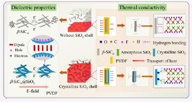针对此问题,综合考虑到高介电、低损耗、高导热及高击穿性能的同步协调和平衡,提出了基于构筑晶体氧化硅界面层来实现平衡良好综合性能的目的。通过在高温1200~1300 ℃下在碳化硅晶须表面生长晶态氧化硅策略构建了新型结构的β-SiCw@SiO2核壳晶须,改变温度及时间可以简捷地调控氧化硅晶态及厚度,从而实现对核壳粒子结构及性能的调控,最终获得结构及性能可控的功能聚合物电介质。研究结果表明,晶体氧化硅比非晶结构更显著地降低了β-SiCw/PVDF(聚偏氟乙烯)的介电损耗及漏电流,保留了高的介电常数。此外,纳尺度晶态氧化硅界面层在碳化硅晶须与PVDF基体界面间构筑了梯度导热结构区域,有效缓解了高导热晶须与极低导热聚合物之间的相界面声子阻抗失配现象,并借助晶态的高导热(大于非晶结构10倍)极大地抑制了界面声子散射,降低了界面热阻和有效地促进了界面声子传递,显著提升了复合电介质的导热性能。