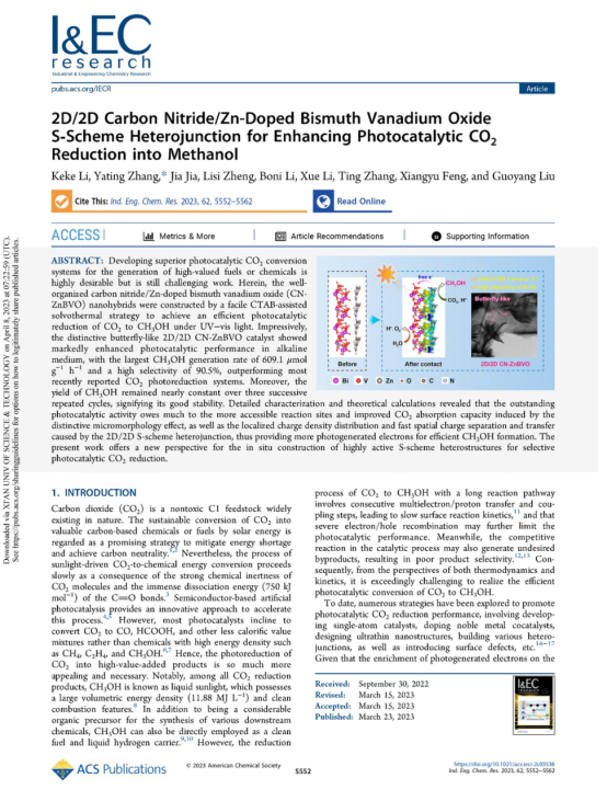 近日,BB贝博艾弗森张亚婷教授团队“陕西省煤基功能炭材料重点科技创新团队、BB贝博艾弗森功能炭材料研究中心”在国际化工领域顶级学术期刊《Industrial & Engineering Chemistry Research》发表题为“2D/2D carbon nitride/Zn-doped bismuth vanadium oxide S-scheme heterojunction for enhancing photocatalytic CO2 reduction into methanol”最新研究成果,是公司化工学科在国际化工研究领域取得的又一重要突破,对于加快化工学科高质量发展,持续提升化工学科在该领域的国际学术影响力具有重要意义。IECR为美国化学会旗下的工程技术领域期刊,是国际化工领域公认的三大顶级学术期刊之一,旨在发表全球化学工程应用领域的最新高质量、原创性研究成果。