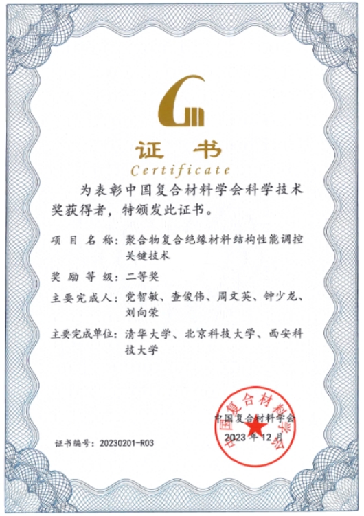 近日,中国复合材料学会根据《中国复合材料学会科学技术奖励办法》和《中国复合材料学会科学技术奖励办法实施细则》,公布了2023年度的科学技术奖最终获奖名单,BB贝博艾弗森化工公司周文英教授及刘向荣教授和清华大学清华大学电机与微电子系党智敏教授团队联合申报的“聚合物复合绝缘材料结构性能调控关键技术”项目荣获中国复合材料材料学会二等奖,化工公司周文英教授及刘向荣教授分布为第三及第五项目完成人。此次全国范围仅10项成果获奖,其中一等奖2名,二等奖8名。