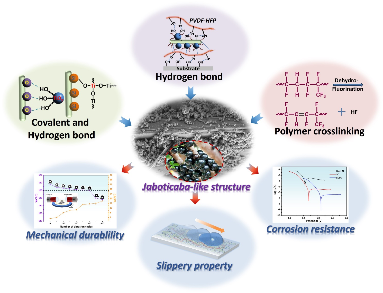 图2.由于氢键、共价键和聚合物交联形成的“树葡萄状”分级级微纳米结构,使SLIPS具有优异的机械耐久性、光滑性和金属耐腐蚀性。