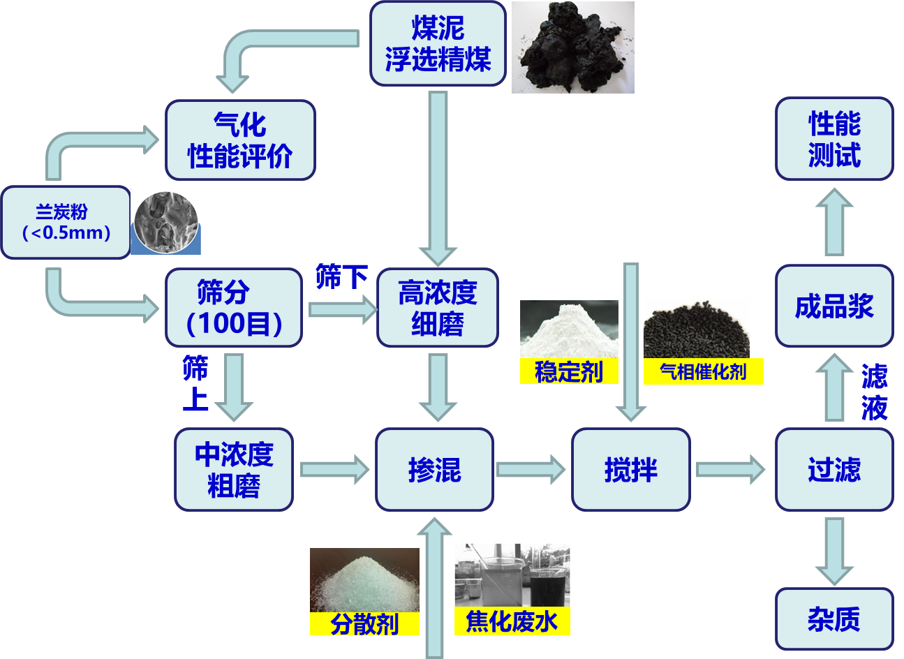 (1)兰炭粉表面的改性技术及新型兰炭水焦浆分散剂制备技术中试与设备;