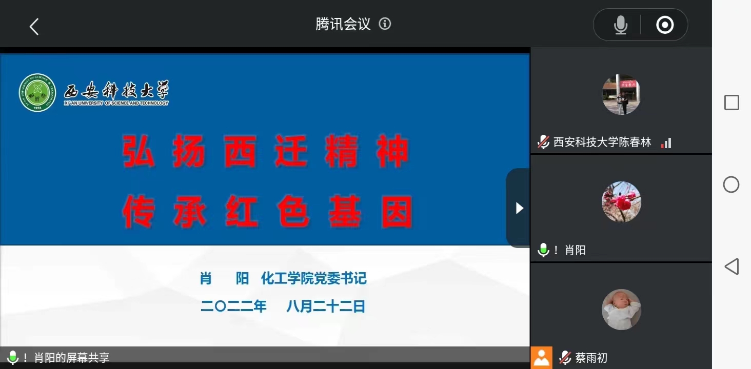 为丰富充实广大参训员工的军训生活,使同学们度过一个有意义、有知识、有温度难忘的军训,深入学习贯彻习近平总书记在省部级领导干部专题研讨班上的重要讲话精神和习近平总书记来陕考察重要讲话精神,使同学们更深刻认识“西迁精神”的重大意义,了解西迁精神的实质内涵和价值追求,让广大青年充分从“西迁精神”中汲取知识力量,提高思想认识,BB贝博艾弗森于8月22日下午利用腾讯会议在线上开展军训特殊党课,化工“导”论系列讲座。