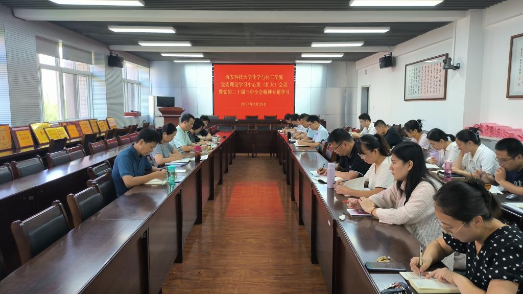 8月28日,化工公司在临潼校区召开委党委理论学习中心组(扩大)会议,专题学习党的二十届三中全会精神。公司党委理论学习中心组成员,纪委委员,教工党支部书记,各系(室)主任、副主任,工会主席、经理助理、团委书记,教务办主任,学科秘书参加会议,公司党委书记肖阳主持会议。