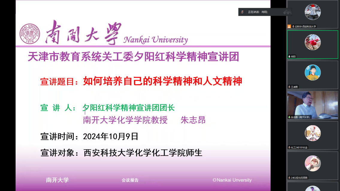 10月9日,天津市夕阳红科学精神宣讲团团长、南开大学化学公司教授朱志昂受化工公司刘向荣教授邀请为BB贝博艾弗森师生作题为“如何培养自己的科学精神和人文精神”的专题报告。报告会由公司党委书记肖阳同志主持,化工公司本科生、化学专业研究生及化学系党支部教师参加了会议。