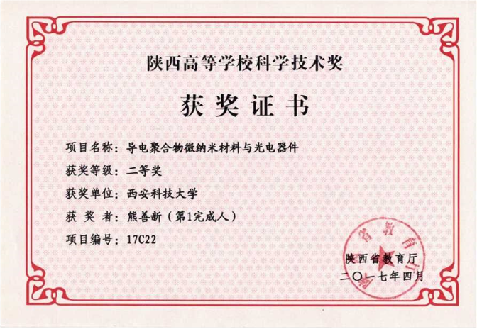 熊善新同志,博士,教授,陕西省“青年百人计划”入选者,中组部“西部之光”访问学者,“光电功能材料与器件”校级创新团队负责人。2005年8月至2011年8月在新加坡南洋理工大学担任Research Scientist,其中2007年7月至2008年1月在加州大学洛杉矶分校材料公司以博士后身份进行学术交流。主要研究工作集中于制备和研究导电聚合物及其与无机功能粒子复合纳米结构的电致变色性能及在化学能源方面的应用。现任中国电致变色学会(筹)秘书长,国际太阳能与环境材料学会、新加坡材料学会、中国化学会会员,及多个国际学术期刊审稿人。主持国家自然科学基金等项目6项,发表SCI论文50余篇,出版专著一部,授权发明专利8项,多次获省部级及厅局奖励。