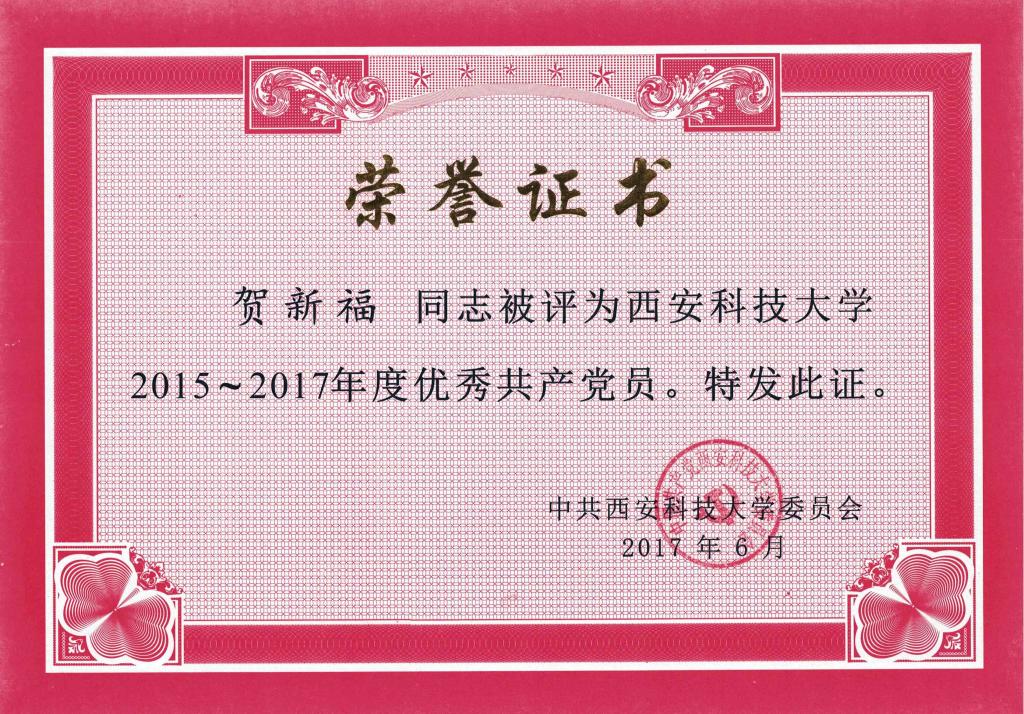 贺新福同志政治立场坚定,热爱党的教育事业,时刻以优秀党员的标准严格要求自己;积极参加公司、公司组织的各项学习和活动;关爱员工、关心集体;以自己的一言一行影响和引导员工;获2015-2017年度校优秀共产党员,并多次荣获院优秀教师、优秀共产党员等荣誉称号。